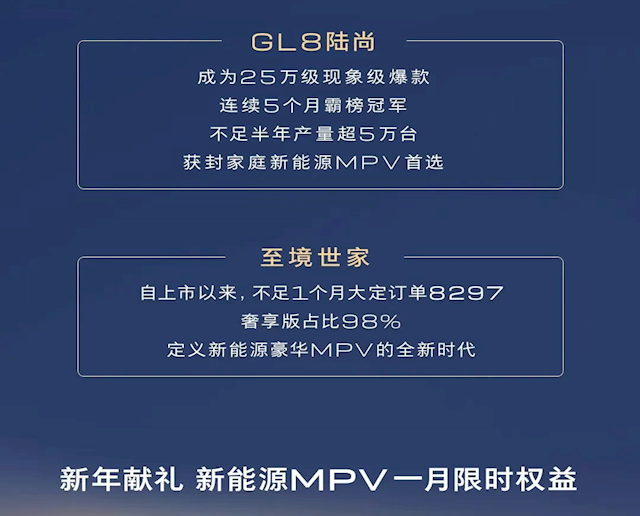 GL8陆尚成为25万级征象级爆款,连气儿5个月霸榜冠军,不及半年产量超5万台,获封家庭新能源MPV首选。