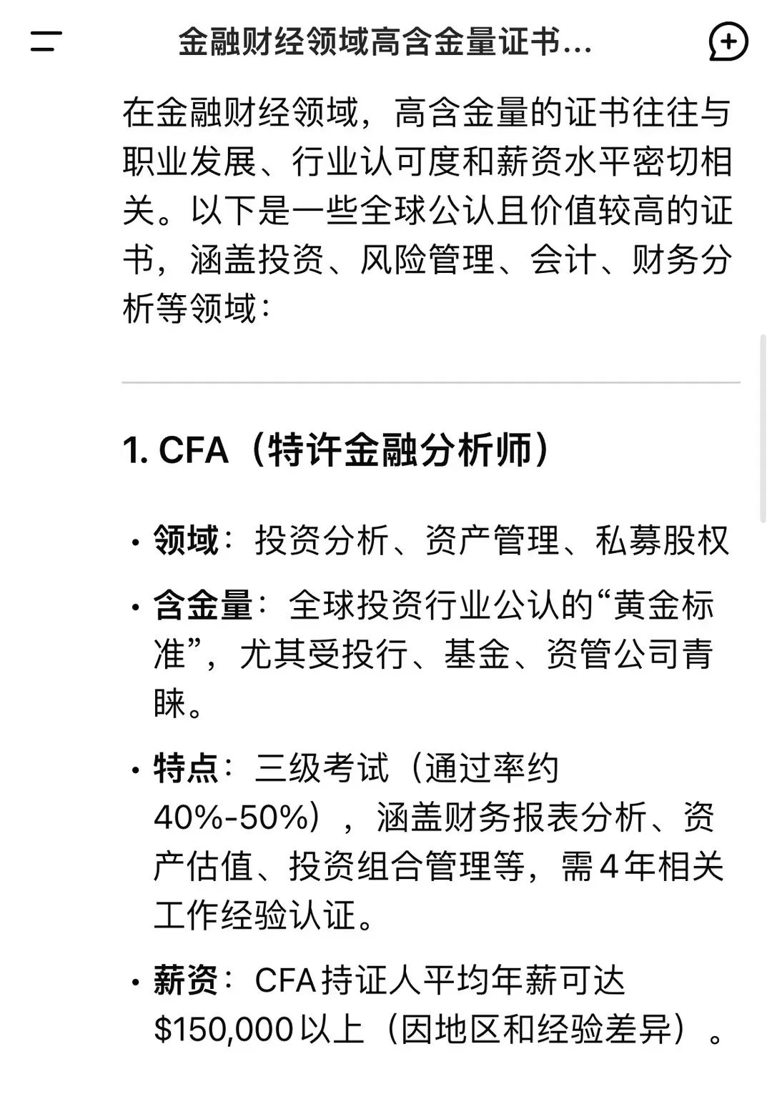 在DeepSeek的谜底中,稳居TOP1位置的CFA(Chartered Financial Analyst,特准金融分析师)是全球金融投资范围最严格亦然最具巨擘的文凭,被誉为“金融行业东谈主才的黄金规范”。