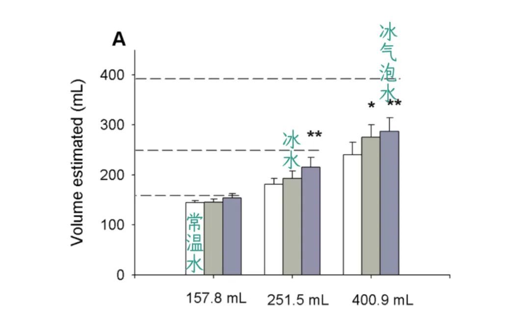 霸术东谈主员让受试者们使用吸管杯喝饮料,况且不行用手拿水杯,然后让受试者预估我方喝了若干饮料。遏抑显露,喝冰气泡水的东谈主预估的比常温水多22%。