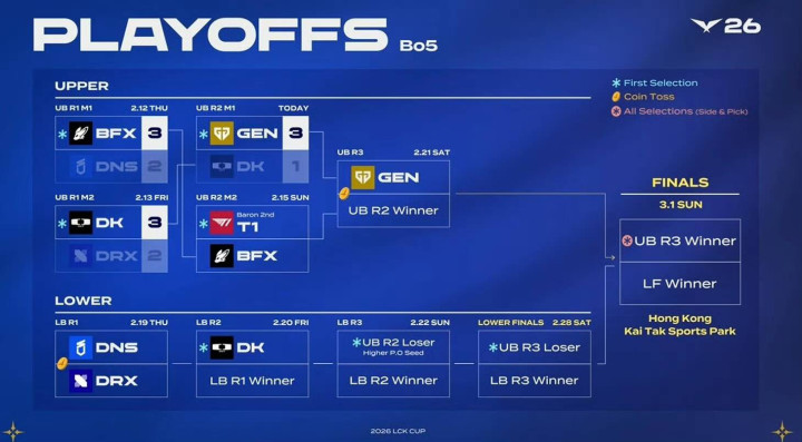 LCK赛区第一赛段淘汰赛,还是进行到第二轮了,在此前的比赛中,BFX和DK各自打满五局,晋级到季后赛六强,GEN算作旧例赛第一,有优先选拔敌手的权益,训诲组和选手们扣问之后,选拔了他们以为,更好嘱托的DK,因此第二轮比赛上半区DK打GEN,下半区T1和BFX自动组队。