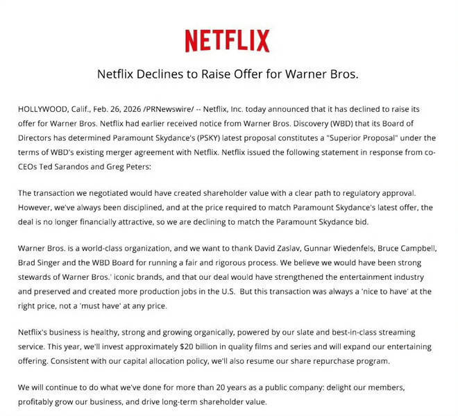 1905电影网专稿 2026年2月26日,好意思国流媒体巨头网飞在官网发布声明欧洲杯体育,讲求告示销毁对华纳兄弟探索公司的收购贪图。