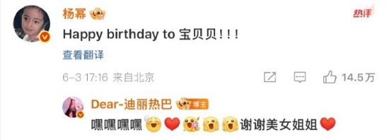 关于杨幂的道喜,迪丽热巴很快上线复兴,并称杨幂为“好意思女姐姐”。两东说念主对彼此的称号,让粉丝不禁大叫“太好磕了。”好意思女之间的友谊也超甜。