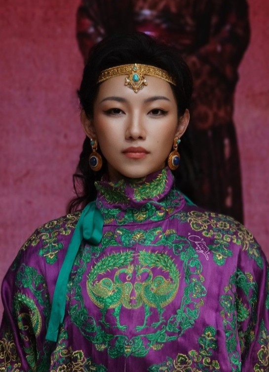 长长的拖尾发型,还有头上布满的金饰,齐诠释了她的地位。