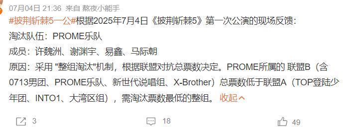 看到节目组篡改录制表率,寰宇齐以为本季不会出现淘汰赛的时辰,范围第一轮舞台公演录制后,网上却传出《饱经沧桑5》淘汰一个“团”的音信,而被淘汰的团便是“PROME乐队”。