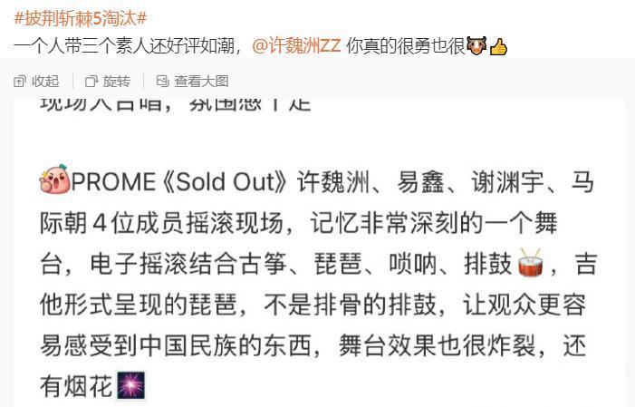 从参与录制的网友响应上看,他们带来的《Sold Out》舞台给寰宇留住长远的印象,是电子摇滚连合古筝、琵琶、唢呐、排饱读、吉他等多种乐器,让现场的不雅众们感受到民族的东西,舞台效力相当炸裂,以致有网友默示:前两团的融会并莫得让场子热起来,但“PROME乐队”作念到了,范围第一轮舞台公演,他们就被淘汰出局了。