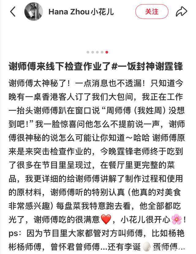 8月12号晚,他不打一声呼唤,就带着团队“杀”到了《一饭封神》选手小花儿所任职的餐厅。小花儿在外交媒体上共享了这个大惊喜,说谢师父这是“突击查验功课来了”。