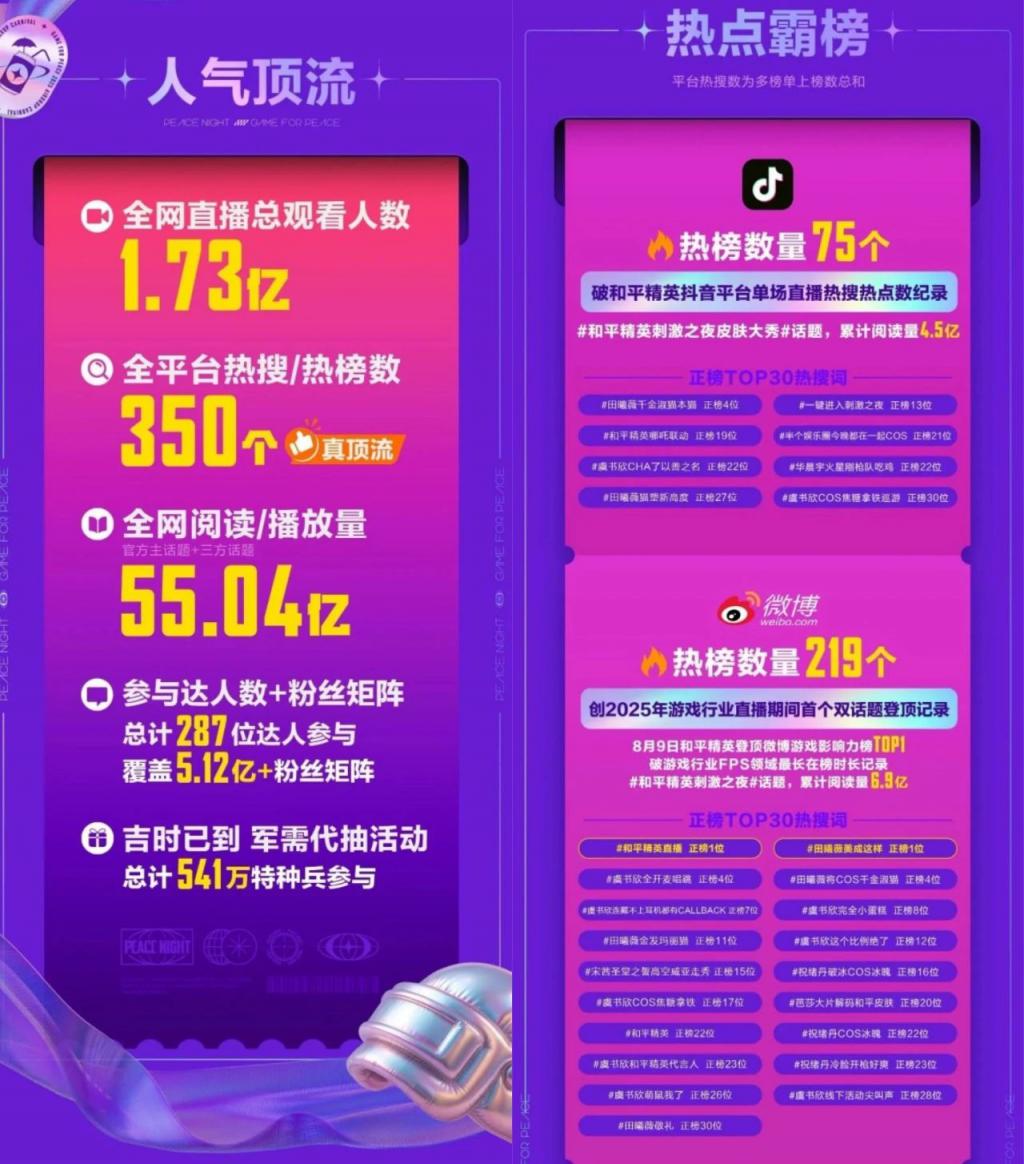 8 月 13 日官方发布“刺激战报”——“刺激之夜”全网直播总不雅看东说念主数 1.73 亿、全平台热搜与热榜数 350 个、全网阅读及播放量 55 亿的数据得益,也曾直不雅向外界阐述了,何为一代玩家有一代玩家的“新春晚”。