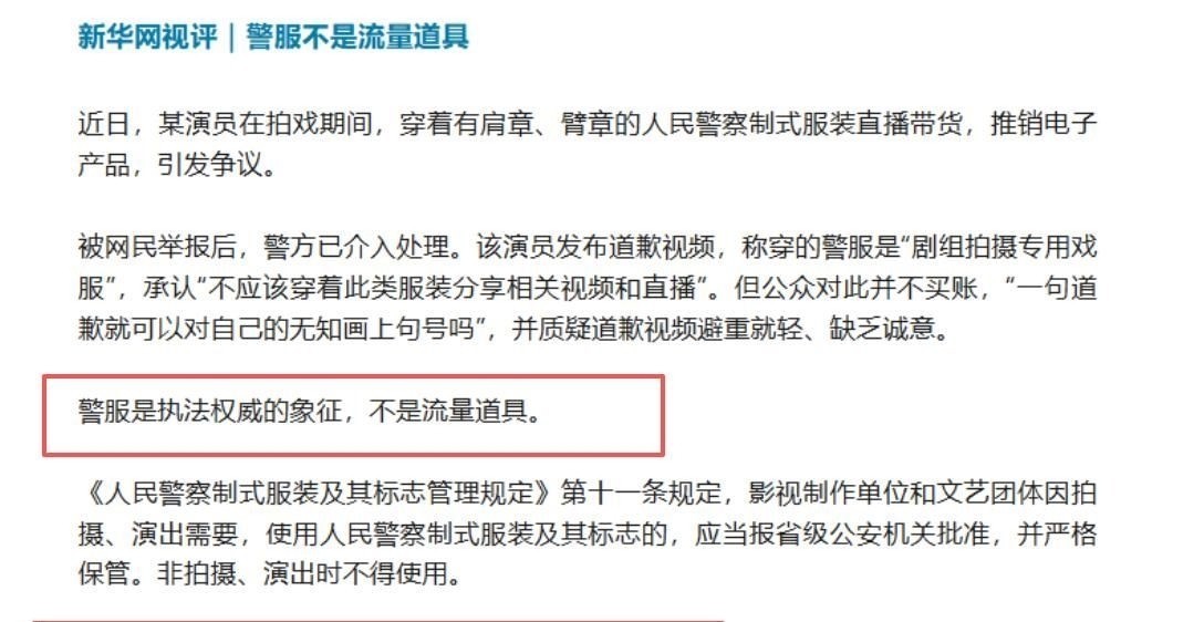 新华社旗下媒体新华网发表重磅挑剔,直指“警服是国度司法庄严的体现,绝弗成沦为网红博取流量的说念具!”