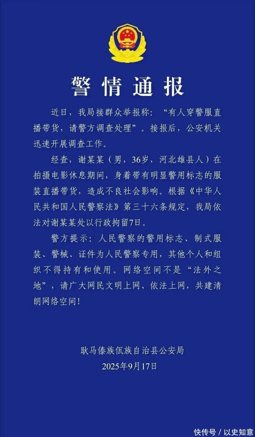 9月19日,云南省公安机关认真发布警情通报,证明谢孟伟存在“作恶使用警用标志服装进行麇集直播”的作恶行径。