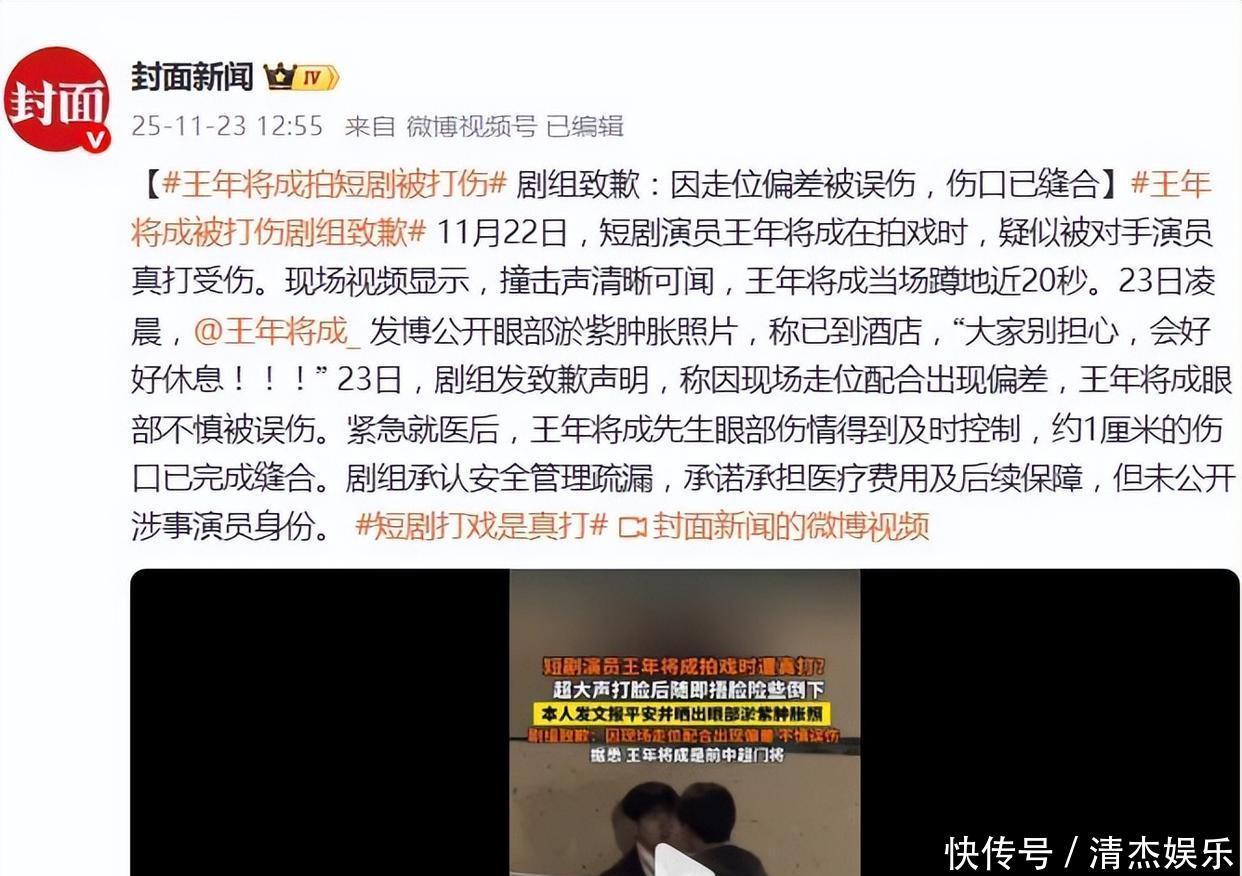 11月22日,转型演员仅半年的前中超门将王年将成在短剧《芝芝不倦》拍摄中,遭敌手演员未摘适度的重拳直击左眼。现场视频记载下惊悚一幕:宽绰撞击声后,王年将成捂脸几乎倒下,迟迟莫得缓过来,这说念1厘米的眼部扯破伤,不仅需要缝针调治,更撕开了短剧行业“用肉身换流量”的疮疤。