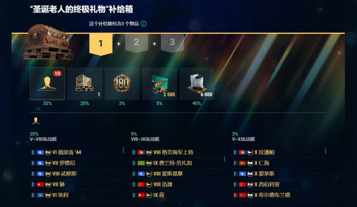 值得一提的是,本年圣诞行径还新增了“圣诞老东说念主的终极礼物”补给箱,这箱子仅限军械库金币购买,池子实质和其他圣诞箱疏浚,但高等船和稀有船的爆率更高,况兼掉落其他奖励的数目也更多!条目允许的一又友可以开开看。
