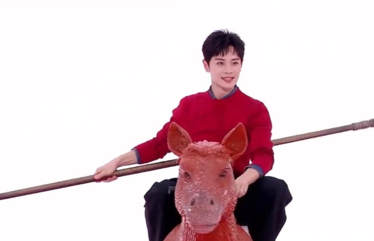 孤单亮眼红色毛衣配玄色长裤本就富饶抢镜,更离谱的是他还骑着一匹儿童木马渐渐前行,