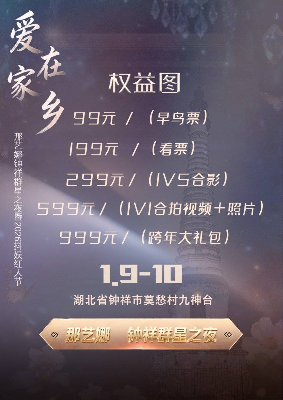 宣传海报显现,这场名为“爱在家乡·那艺娜钟祥群星之夜暨2026抖娱红东说念主节”的晚会,将于2026年1月9日至1月10日晚,在钟祥莫愁村景区上演。晚会由当地网红那艺娜领衔,由曲艺演员侯耀华、歌手东来东往、旭日阳刚组合的王旭、音乐东说念主东方骏等东说念主为主要演员。另外,还有谢孟伟等一系列东说念主员担任贺喜嘉宾。