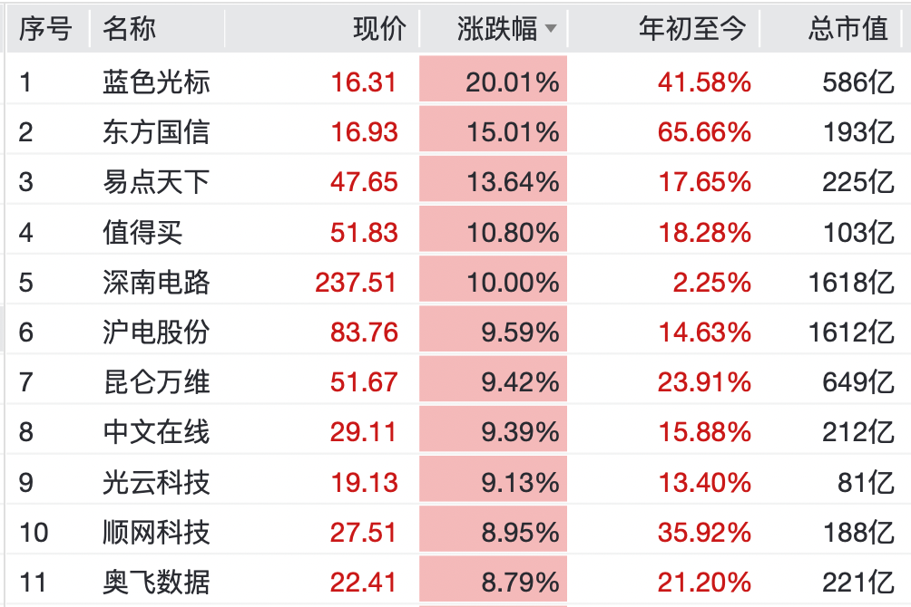 AI讹诈指数涨逾5%。蓝色光标录得20cm涨停,东方国信涨超15%,易点全国涨超13%,值得买、汉文在线、昆仑万维、光云科技、深南电路等均涨超9%。