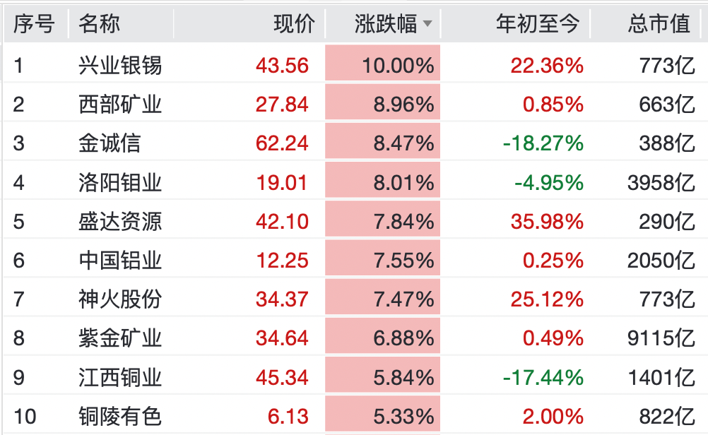 工业金属方面,兴业银锡录得10cm涨停,西部矿业涨近9%,金诚信、洛阳钼业、盛达资源、中国铝业等均涨超7%。