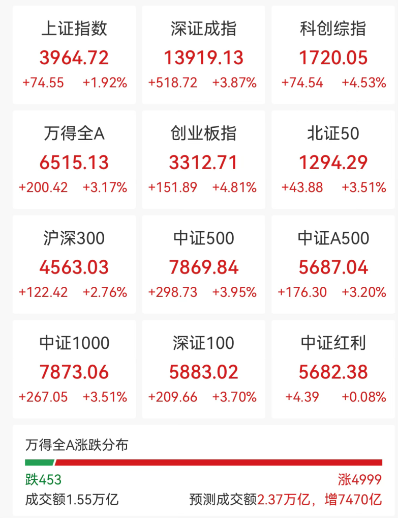 杀青午间收盘,沪指涨1.92%,深证成指涨3.87%,创业板指涨4.81%,科创综指涨4.53%。