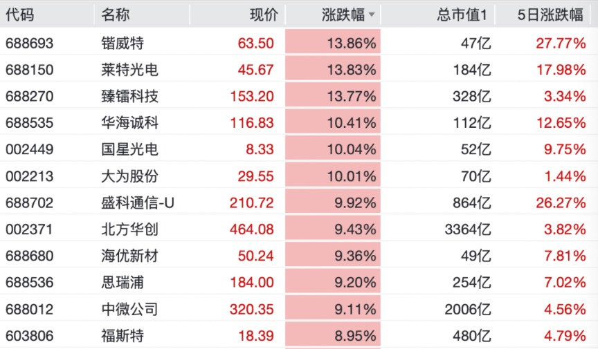 东山精密、铭普光磁、剑桥科技均录得10cm涨停,长芯博创涨超10%,罗博特科、盛科通讯等均涨超8%。