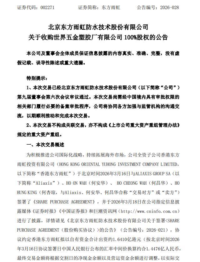 4月9日,东方雨虹(002271.SZ)公告称,公司全资子公司香港东方雨虹拟以自有资金所有出资约1.6410亿港元(约合1.4476亿元东说念主民币)收购全国五金塑胶厂有限公司100%股权。