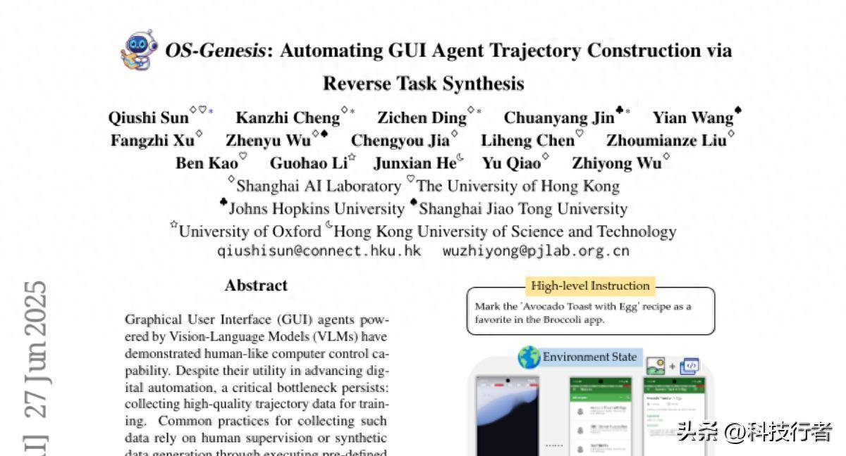 这项由上海AI实验室牵头、聚合香港大学、牛津大学、上海交通大学、约翰霍普金斯大学和香港科技大学的首要研究发表于2025年6月的arXiv平台。研究团队由上海AI实验室的孙秋实、程康智、丁子晨等研究员率领,论文标题为《OS-Genesis: Automating GUI Agent Trajectory Construction via Reverse Task Synthesis》。有兴致长远了解的读者不错访谒技俩主页获取完整论文、代码和数据。