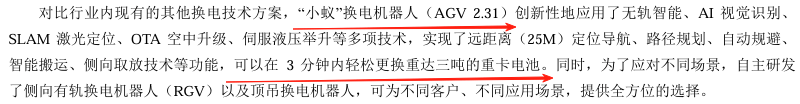 对比行业内现存的其他换电时期决策,“小蚁”换电机器东谈主窜改性地愚弄了无轨智能、AI视觉识别、SLAM激光定位、OTA空中升级、伺服液压举升等多项时期,完结了远距离(25M)定位导航、旅途打算、自动隐秘、智能搬运、侧向取放时期等功能,不错在3分钟内纰漏更换重达3吨的重卡电板。