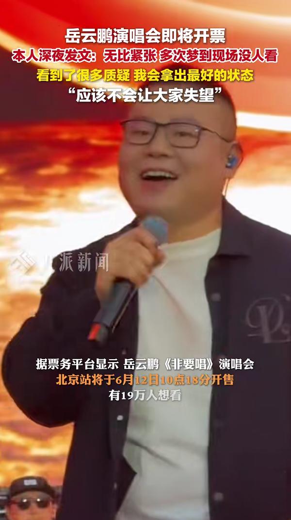 2025年5月,岳云鹏告示将举办个东说念主巡回演唱会,演唱会命名为“非要唱”。“相声演员开演唱会”的计划话题曾也激勉热议。6月11日,该巡回演唱会首站北京站门票在大麦网已投入预约抢票气象,并夸耀倒计时,6月12日10点18分开抢。
